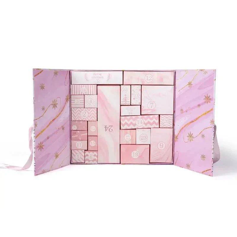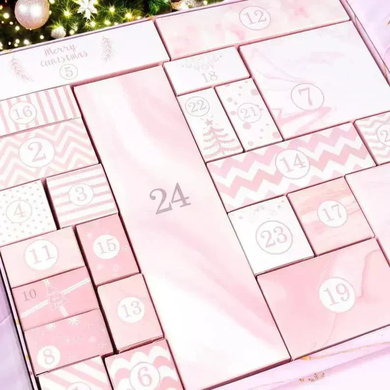 Ten elegancki różowy kalendarz adwentowy zawiera 24 ponumerowane pudełka na każdy dzień grudnia, zapewniając magiczne wrażenia związane z codziennym otwieraniem pudełek.
