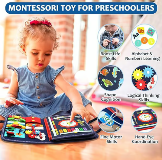 🎓 Montessori Edukacyjna Tablica Zabaw Busy Board – Rozwijaj praktyczne umiejętności dzieci i zdolności logicznego myślenia.