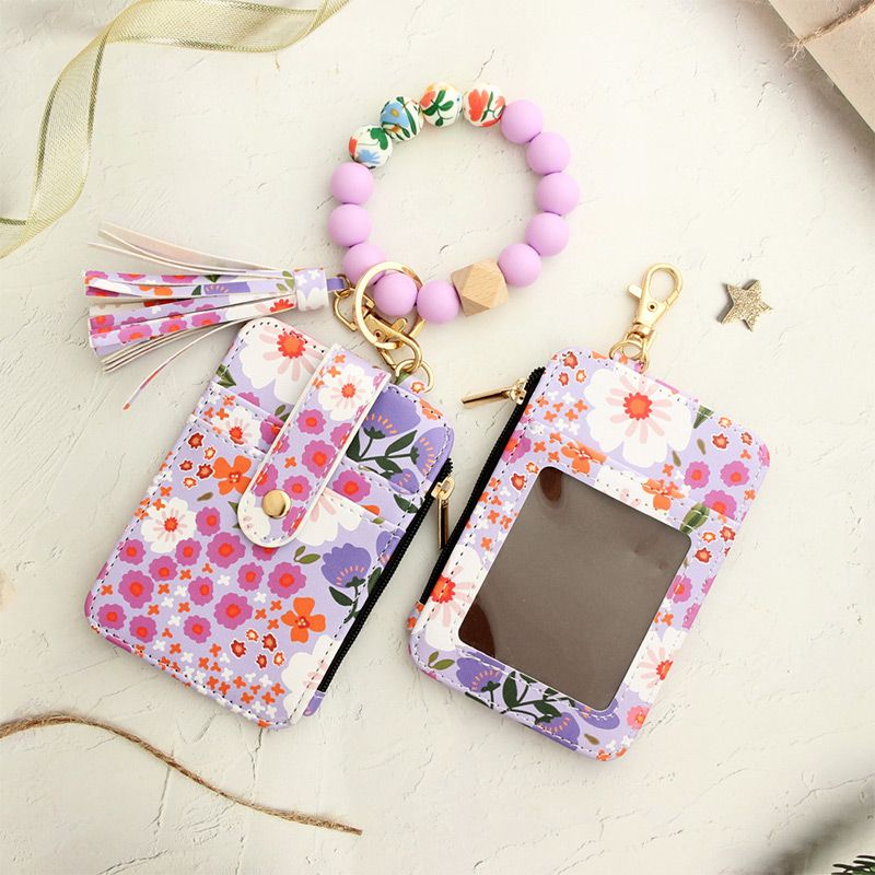 Damskie etui na karty w stylu boho z bransoletką z koralików i brelokiem z frędzlami