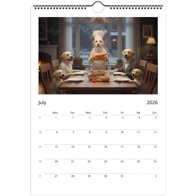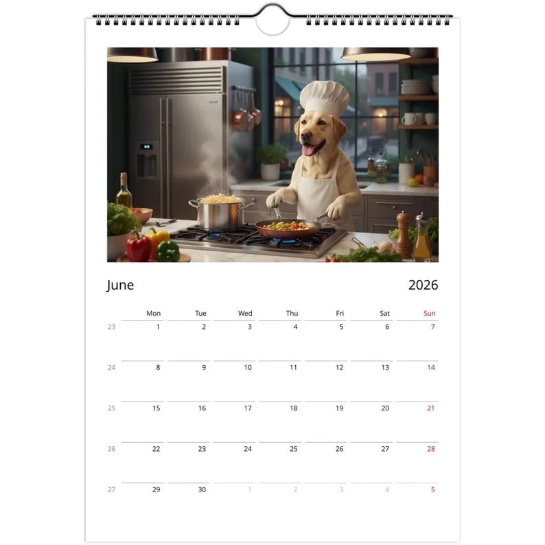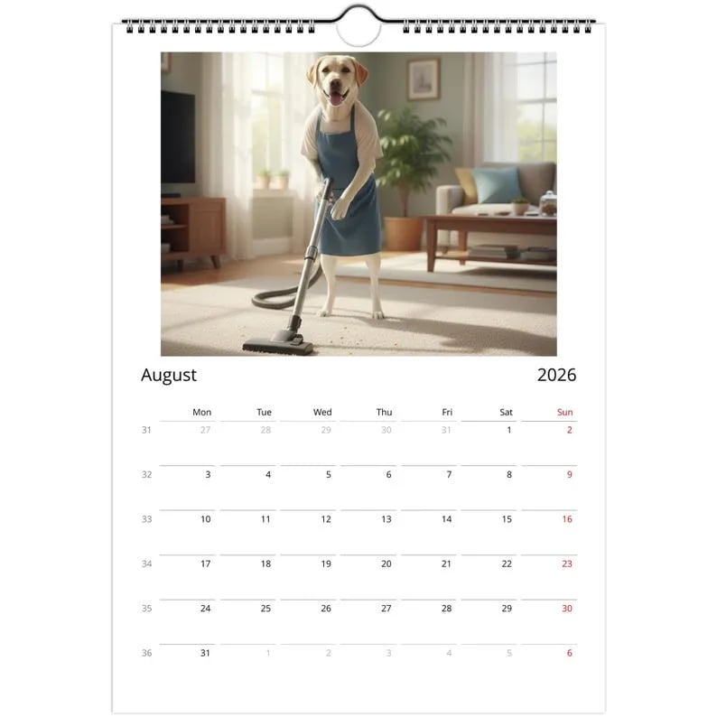 Kalendarz na rok 2026 w tematyce labradora. Przedstawia psa rasy labrador retriever, który wykonuje codzienne ludskie czynności.