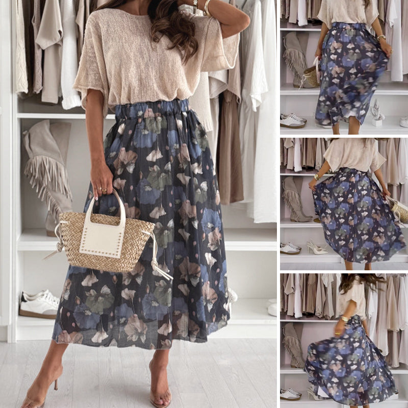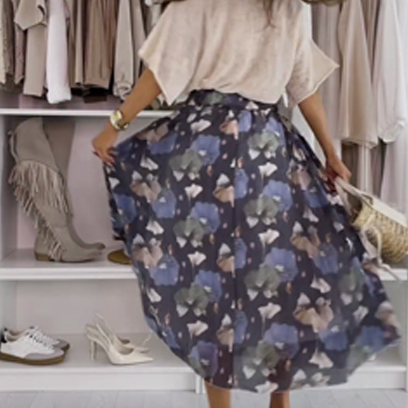 NIEBIESKA SPÓDNICA Z NADRUKIEM – Ta średniej długości spódnica przyciąga wzrok świeżym odcieniem niebieskiego z delikatnymi nadrukami i emanuje romantycznym urokiem. Dodaje Twojej stylizacji żywego akcentu i podkreśla kobiecą elegancję.
