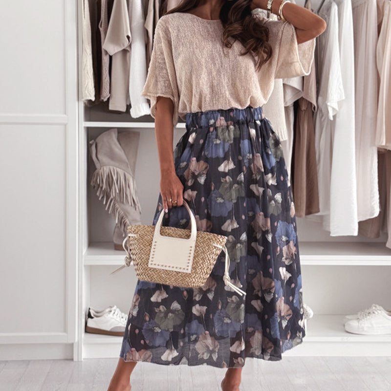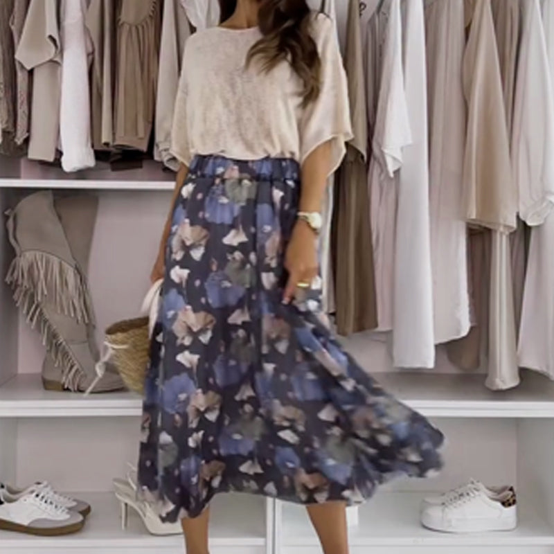 🌸Beżowa koszulka + niebieska spódnica z nadrukiem.