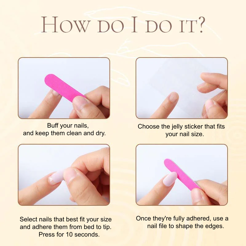 Żelowe naklejki nadają się do krótkotrwałego noszenia i ponownego użycia. Do dłuższego utrzymania zaleca się użycie osobnego kleju do paznokci.